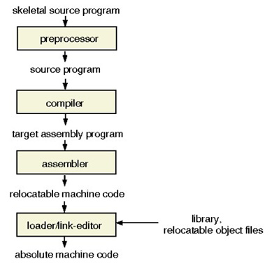 A language processing system includes the following components: (i) preprocessor, (ii) compiler, (iii) assembler, (iv) linker, and (v) loader.