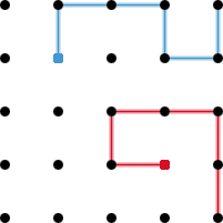 It is a board game for two players who take turns in drawing segments of a snake. The last player able to move wins. The game is played on a grid; 6×6 is a good size. The above game is played on a matrix of 5×5 dots. The first player, Blue (top), starts in the second row and column, and the other player, Red (bottom), starts in the last but one row and column, as shown by the blue and red squares. The players take turns in growing a snake, extending it a segment at a time by drawing a horizontal or vertical line from the previous dot to an adjacent dot. Each player must avoid touching either his/her opponent’s snake or his/her own snake. The first player unable to move loses. |