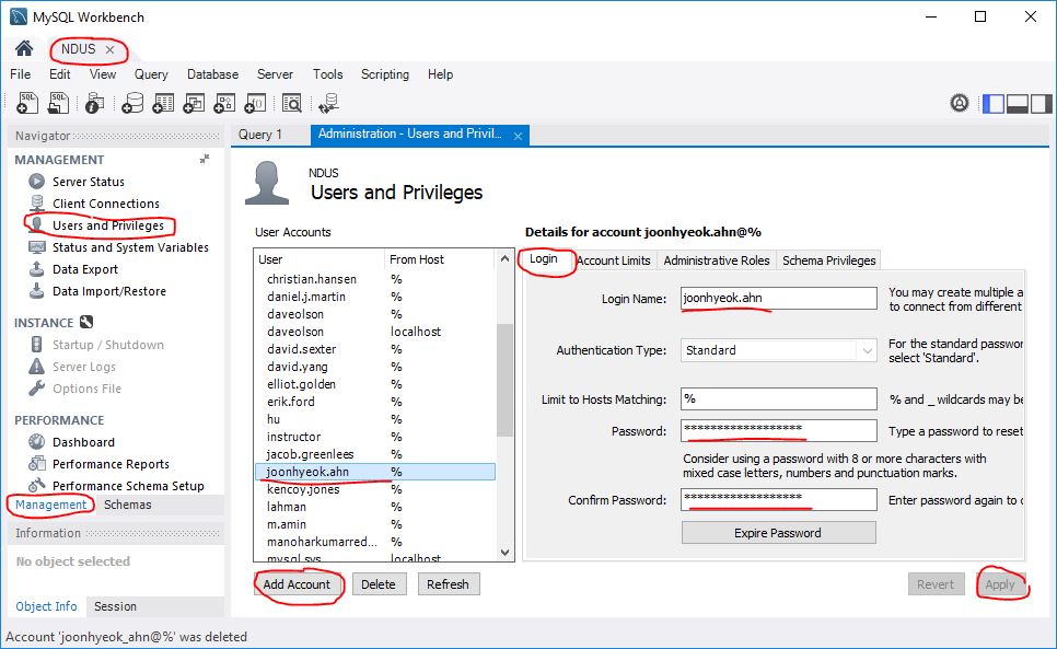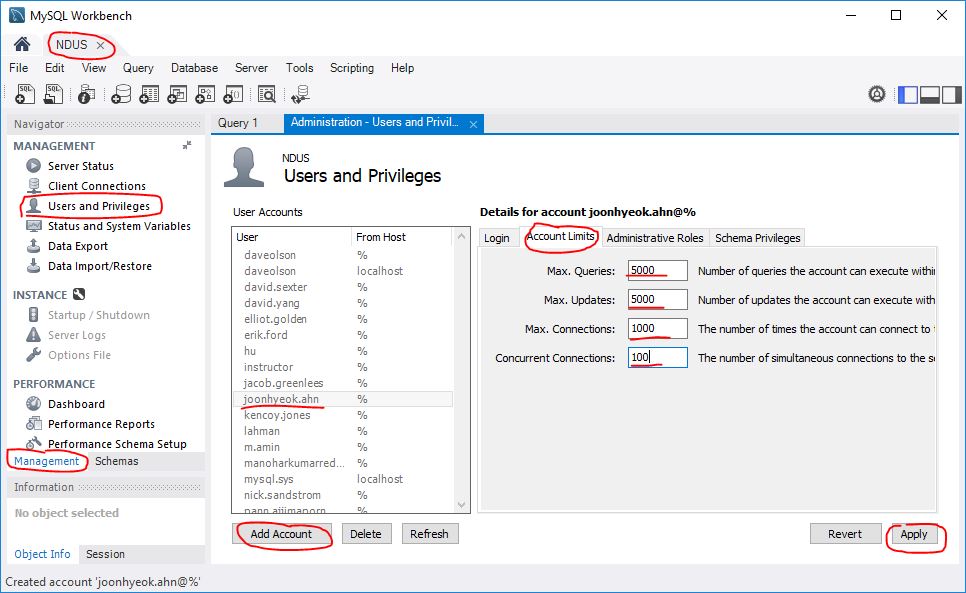 - Creating users (superuser: undcsadmin@undcsmysql)