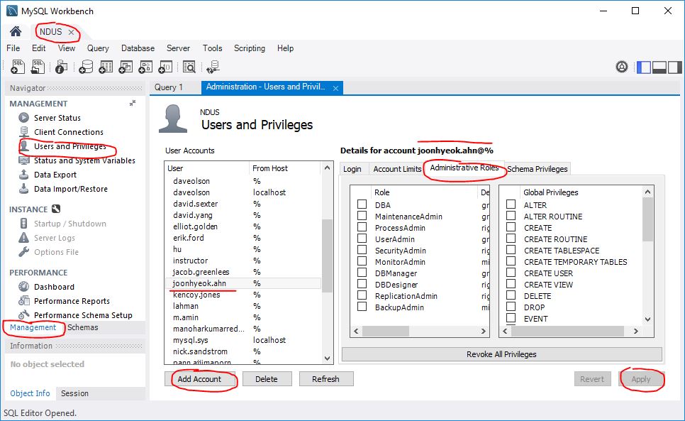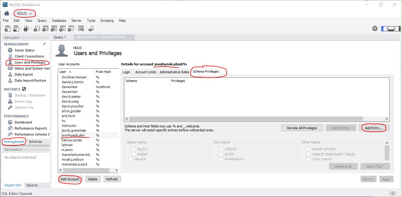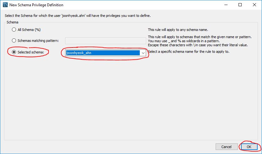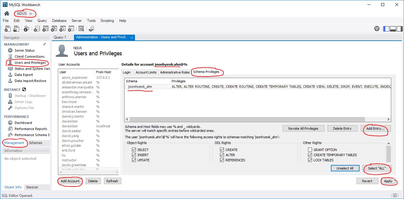 - Object Rights: SELECT, INSERT, UPDATE, DELETE, EXECUTE, SHOW VIEW
