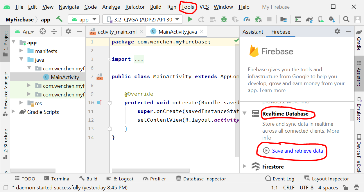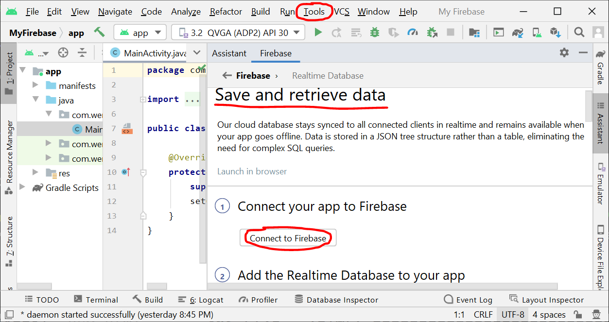 Connect the Android Studio project to the Firebase project by clicking on Tools ⇒ Firebase ⇒ Realtime Database ⇒ Save and retrieve data.
