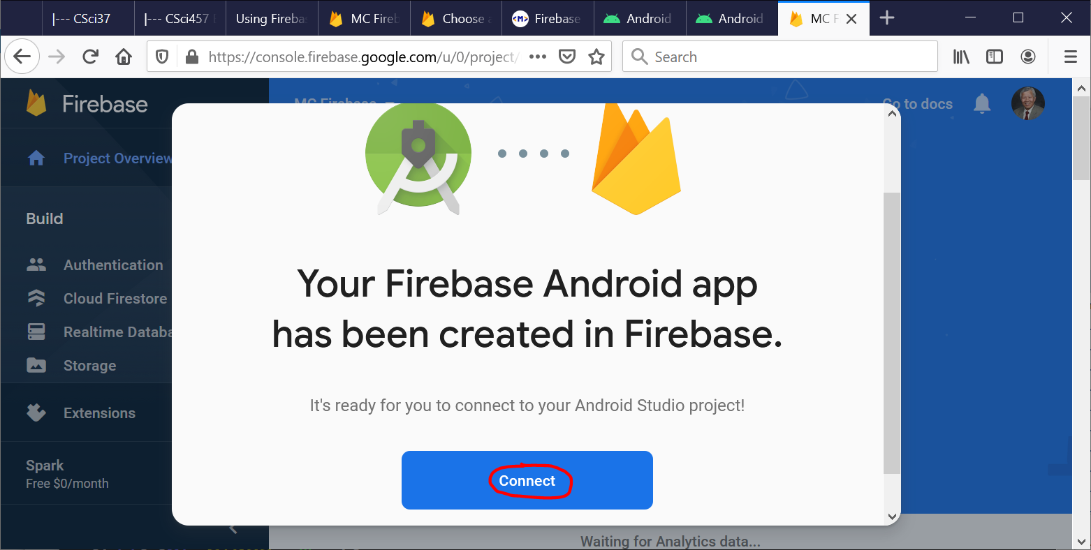 Select the project that you have created on the Firebase website and click on “Connect to Firebase.”