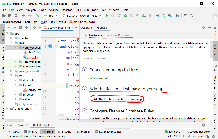- Next, you have to add the dependency of Firebase Database in your project by clicking on “Add the Realtime Database to your app” button and then “Accept Changes.”